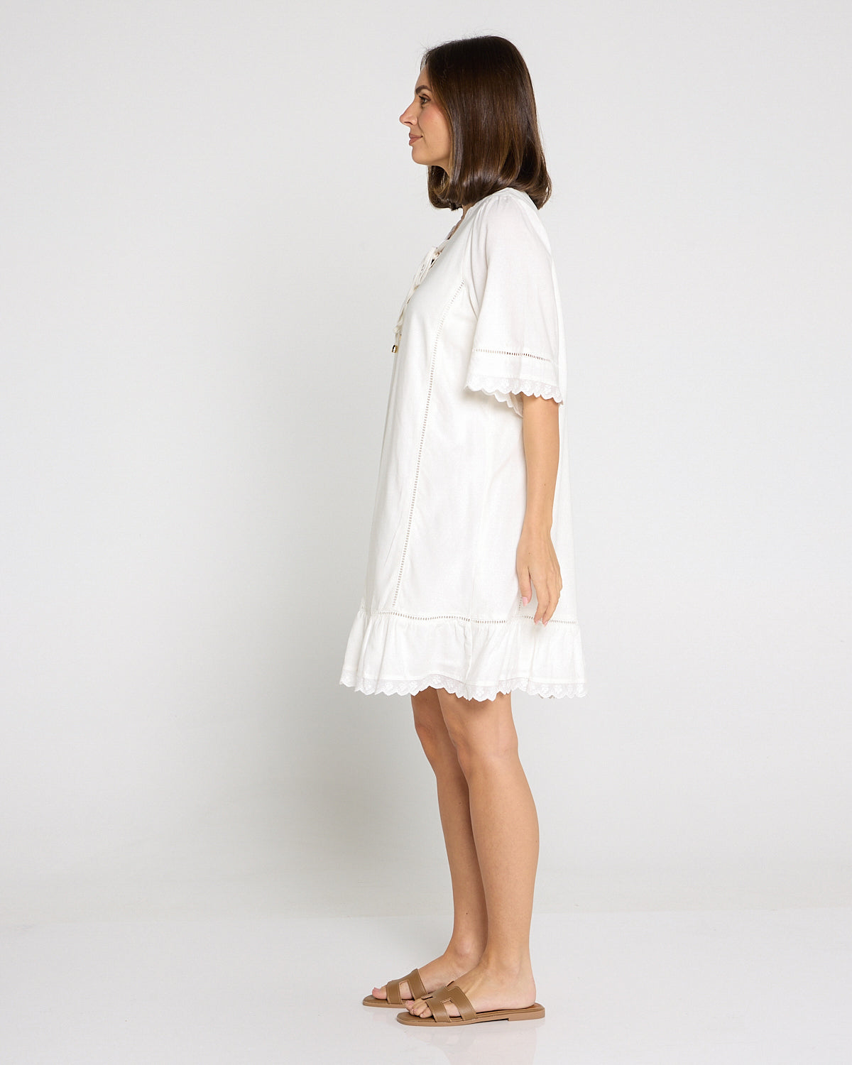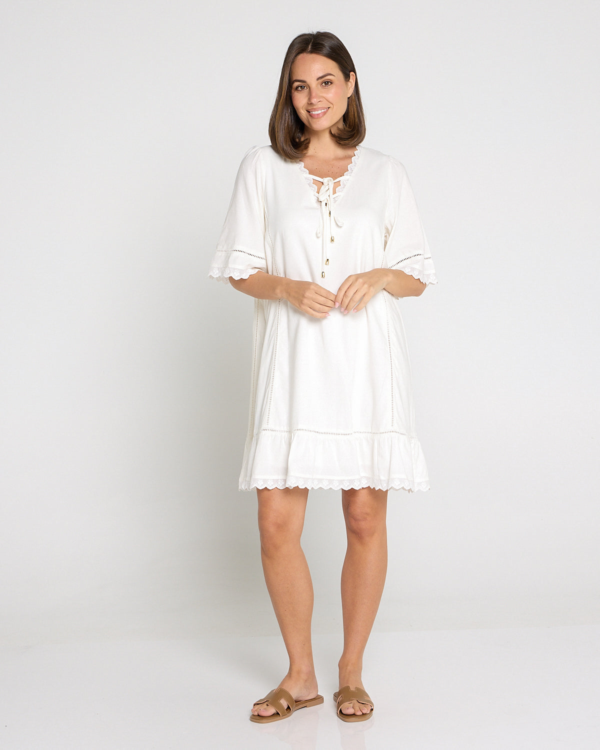The Elsie Lace Trim Dress in ivory by Shareen Collections is a breezy, feminine choice for warm-weather days. Designed with a relaxed shift silhouette, it features a lace-up neckline with tassel ties, fluttery elbow-length sleeves, and delicate lace trim along the cuffs and hemline. The subtle ladder inserts add a touch of texture, while the lightweight linen-viscose blend keeps you cool and comfortable. Fully lined for ease, it’s perfect for beach strolls, garden parties, or pairing with sandals for a polished holiday look.