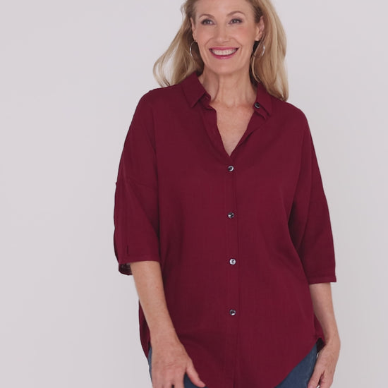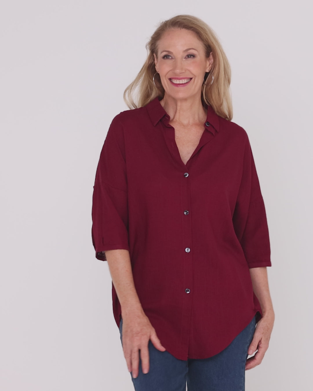 Soft, timeless and effortlessly polished, the Elton Linen Shirt in Burgundy is a versatile staple designed to work across seasons. The rich burgundy tone adds warmth and depth while remaining easy to style with denim, neutrals or soft winter whites. Crafted from a breathable linen-cotton blend, this shirt offers a naturally cool feel with a lightly textured drape that wears beautifully throughout the day. Cut in a relaxed, easy silhouette, it skims the body without clinging, making it a flattering option for everyday wear, travel and casual workdays. Style it loose over slim pants, half-tucked into jeans, or worn open over a simple tank for relaxed layering.