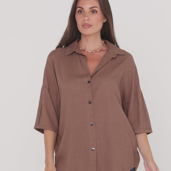 Soft, natural and endlessly versatile, the Elton Linen Shirt in Cocoa is a timeless wardrobe staple designed for relaxed, everyday wear. Cut in a breathable linen-cotton blend, this style offers an easy drape with a softly textured finish that feels comfortable without looking casual. The warm cocoa tone is rich yet neutral, making it effortless to pair back with denim, crisp white pants or tailored linen bottoms. Finished with a classic collar, button-through front and a gently curved hem, this shirt skims the body without clinging and works beautifully worn loose, half-tucked or layered open over a simple tank.