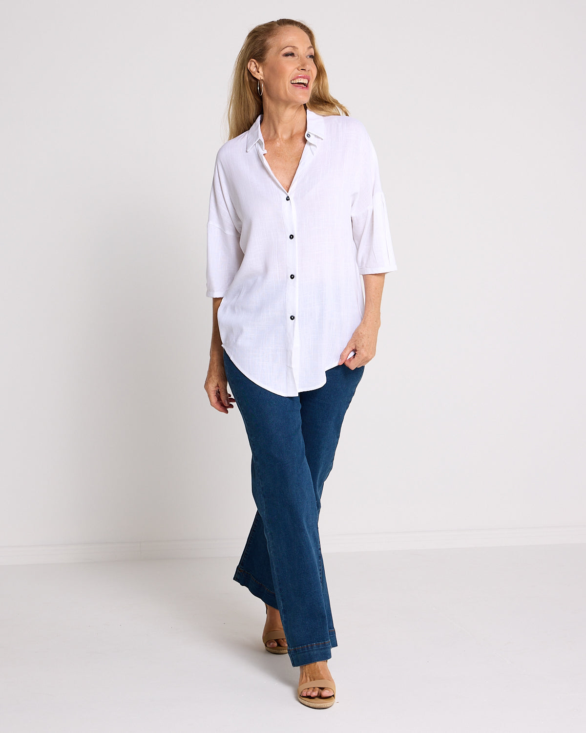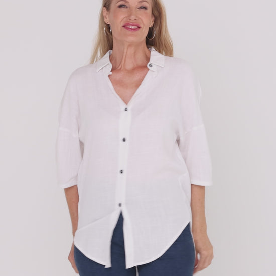 Fresh, timeless and endlessly versatile, the Elton Linen Shirt in White is a true wardrobe staple. Made from a breathable linen blend with a soft woven finish, this style offers an easy, relaxed fit that feels light and comfortable without looking casual. The crisp white colourway highlights the beautiful sleeve pleating and creates a clean, refined look that works across seasons. Perfect for warm days or layering under knits and jackets, this shirt pairs seamlessly with prints, denim, or tailored pants for effortless everyday polish.