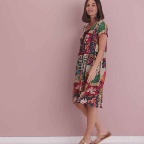 The Emery Dress in Bohemian Dream brings artful energy to warm-weather days. The feather-light cotton-rayon weave drapes beautifully while staying cool and breathable, perfect for errands, lunch dates and holidays. A soft scoop neckline, cap sleeves and fine pin-tucking through the bodice create gentle structure, flowing to a stepped waist seam that flatters from every angle. The abstract patchwork print blends navy with lively rust, teal and cream for a joyful, boho feel. Style with tan sandals now, then add a light cardi when the breeze rolls in.