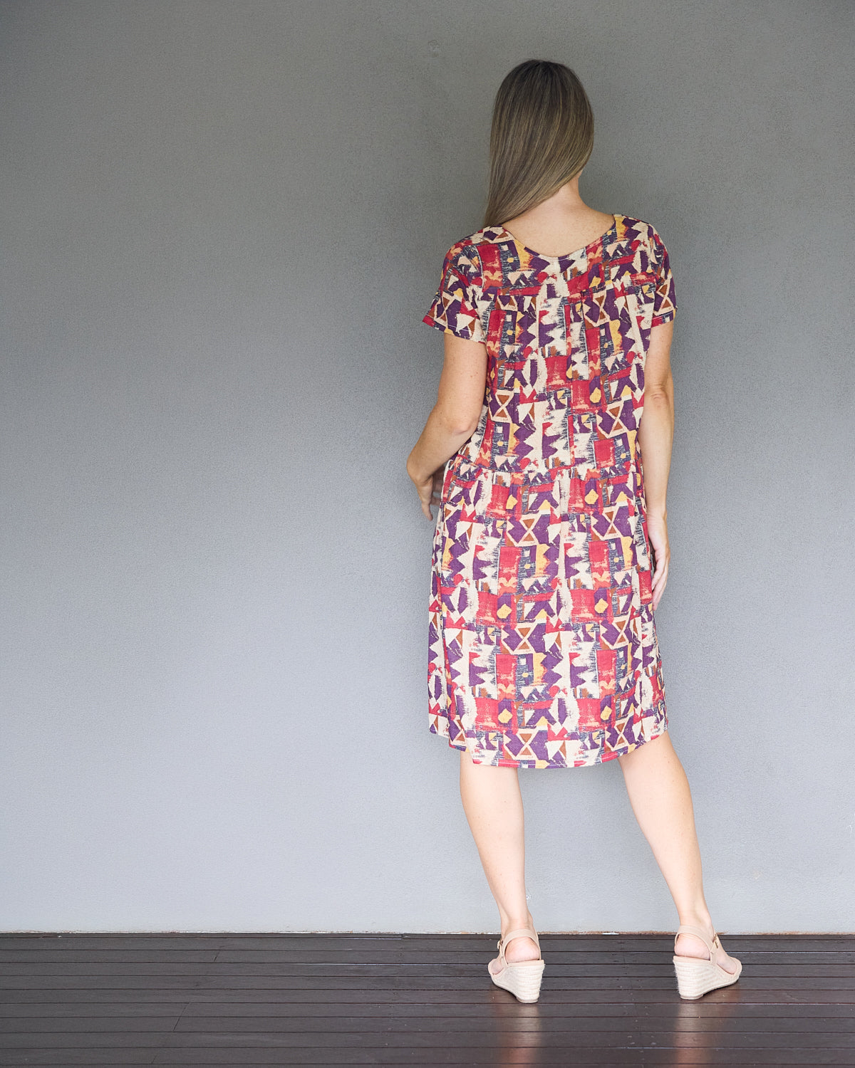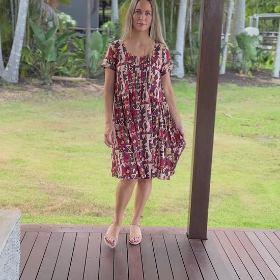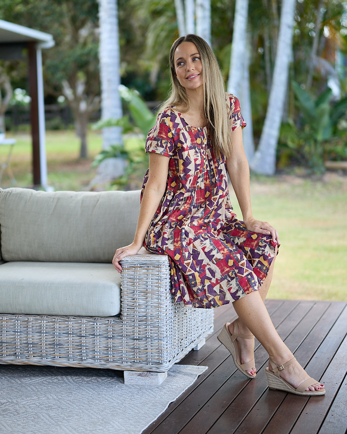 Celebrate a striking new colourway in our much-loved Emery Dress. Crafted from pure cotton, this easy-wearing style is designed for comfort and everyday versatility, with a relaxed silhouette that moves effortlessly with you. The Sundown Geo print blends warm earthy reds, berry tones and soft neutrals with an artistic geometric pattern, creating a look that feels bold yet wearable. Tuxedo pleats through the bust add gentle shape, while the stepped waist seam offers a flattering drape without clinging. Perfect for casual days, travel or relaxed lunches, the Emery Dress pairs beautifully with sandals or trainers, and can be elevated with wedges and statement jewellery.