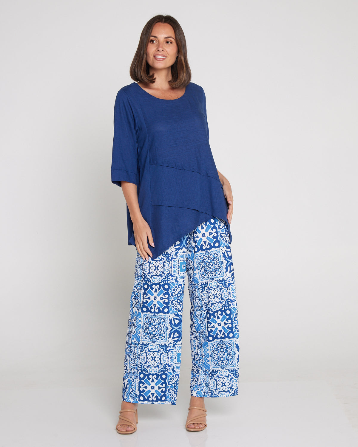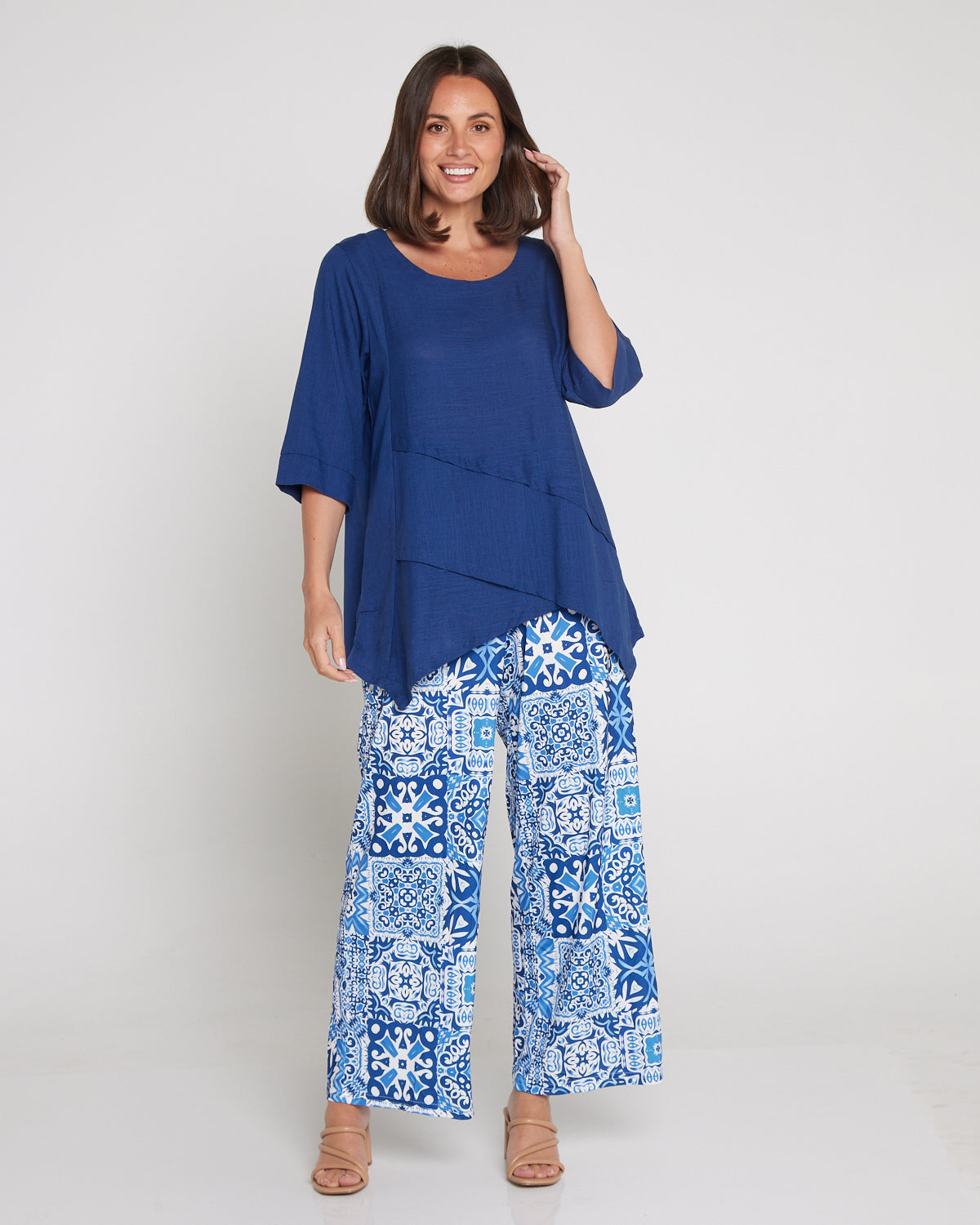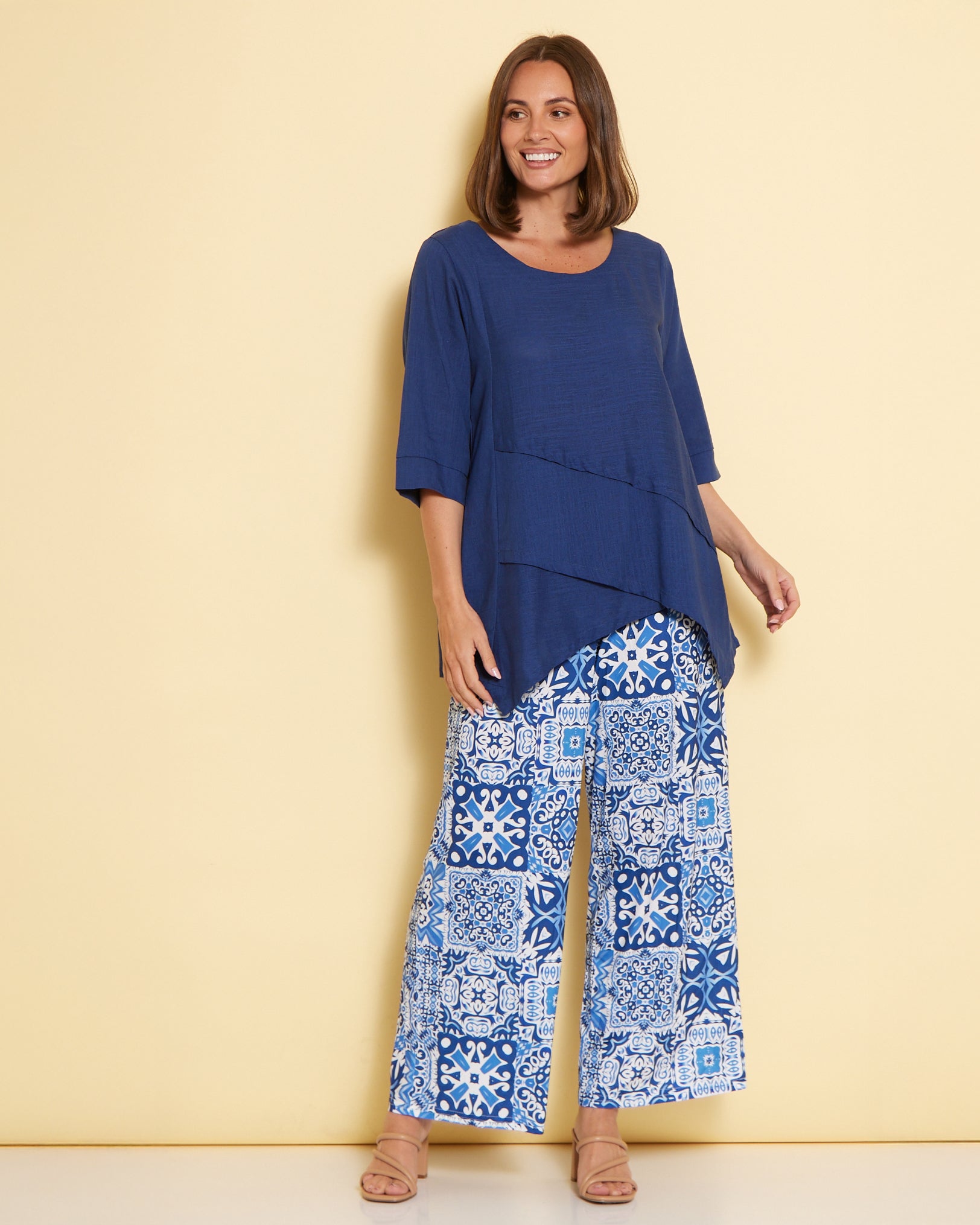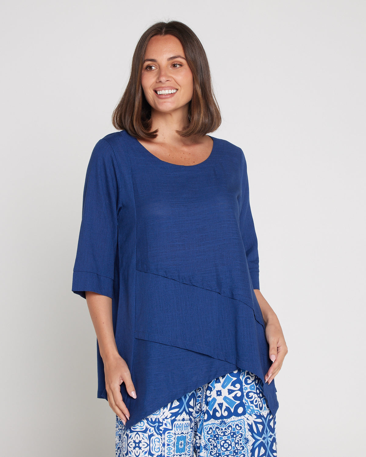 The Esther Top in Denim Blue features a scoop neckline and three-quarter sleeves, highlighted by diagonal seam panels on the front that create a unique layered effect. Its hemline tapers to pointed sides, adding subtle detail. Crafted from a textured woven fabric with no stretch, this top offers a blend of elegant style and comfortable wear.
