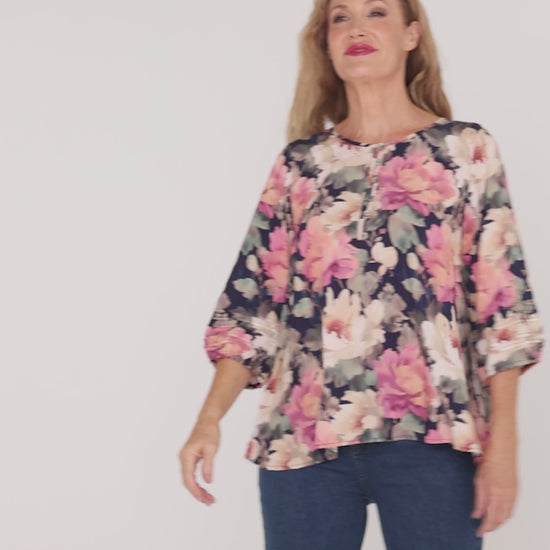 The Farida Blouse – Autumn Floral brings rich colour and effortless polish to your everyday wardrobe. Designed in a beautiful painterly floral with warm pinks, plum tones and soft greenery against a darker base, it’s a flattering option for women in their 40s and 50s who love easy, stylish pieces. Crafted from pure rayon, this woven blouse drapes softly through the body, creating a relaxed silhouette that feels comfortable without clinging.