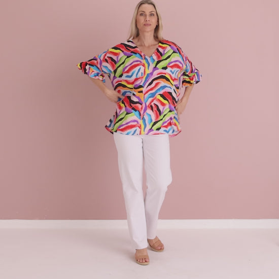 The Farren Top in Rainbow Animal is a fun, feel-good piece that instantly brightens your wardrobe. Cut from soft woven rayon, it drapes beautifully without feeling clingy, skimming over the tummy and hips for relaxed comfort. The colourful animal-inspired print mixes rainbow tones that work back easily with black, white or denim, while the scoop neckline and ruffled sleeves add a feminine touch. Dress it up with slim black pants and wedges for dinner, or keep it casual with crops and flats for coffee dates, weekends and holidays.