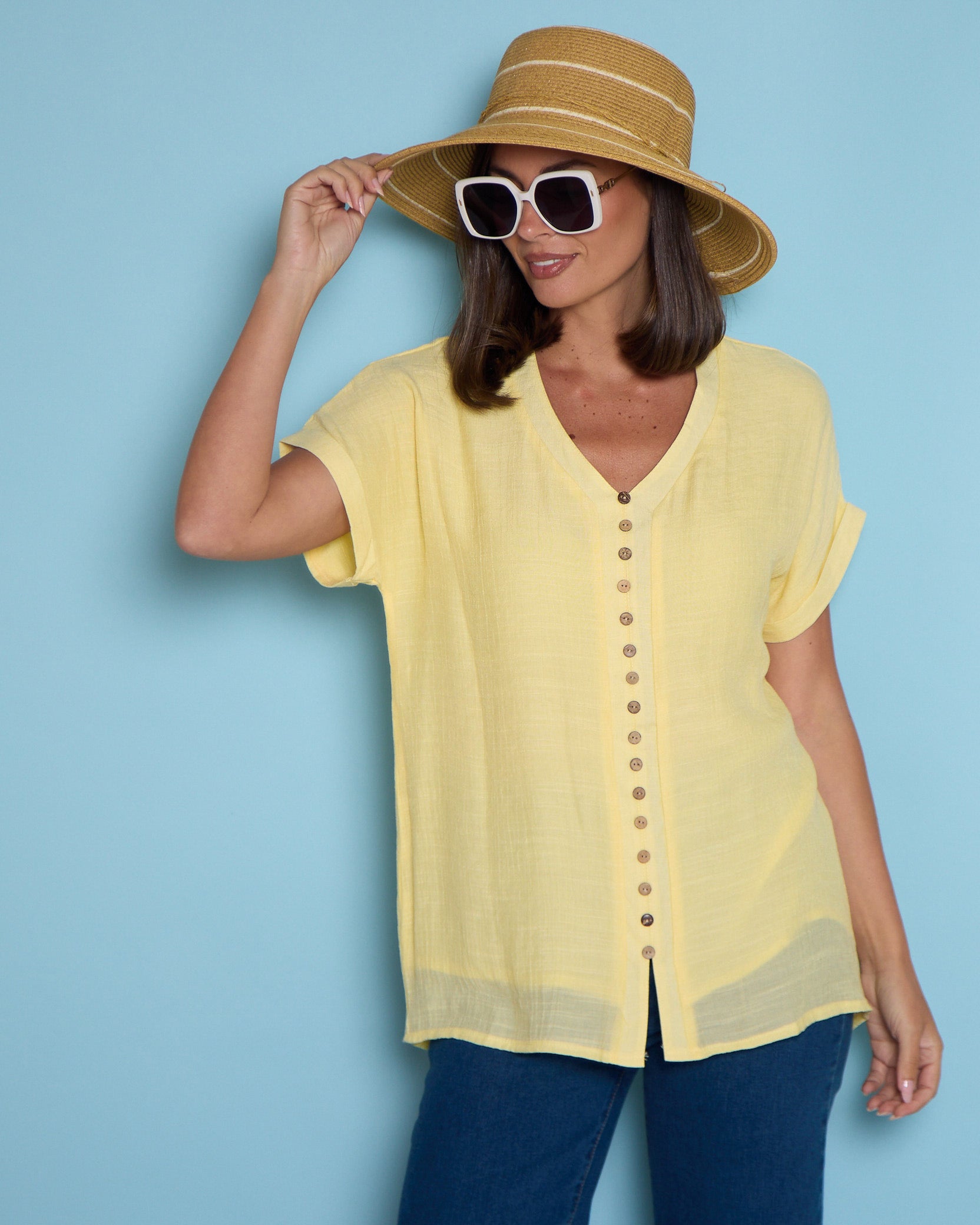 The Gemma Top has just arrived in "butter yellow," one of the biggest colours of the year! Crafted from a textured woven fabric, it offers a luxurious feel and a relaxed silhouette that exudes effortless style. Designed with a flattering V-neck, extended sleeves with rolled cuffs, and coconut shell buttons that add a subtle bohemian detail, this double-layered top is both chic and comfortable. Its non-stretch fabric maintains structure while ensuring easy wear for a versatile, season-ready look.