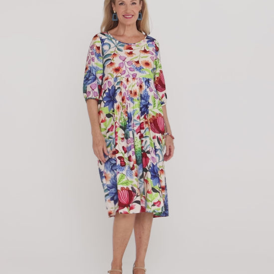 The Genevieve Dress in Botanical Bliss is a beautifully balanced blend of colour, comfort, and effortless polish. Designed by Jolie Saule, this easy-to-wear style features a soft ivory base scattered with vibrant botanical florals that feel fresh without being overpowering. The gently shaped bodice flows into a relaxed skirt with subtle gathering, creating a flattering silhouette that skims the body rather than clings. Crafted from a smooth, mid-weight woven fabric with a soft lustre, it holds its shape beautifully and feels refined enough for everyday to occasion wear. Perfect for lunches, casual events, or travel days, it styles effortlessly with wedges, sandals, or a light jacket when the weather cools.