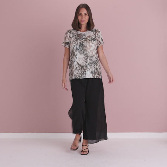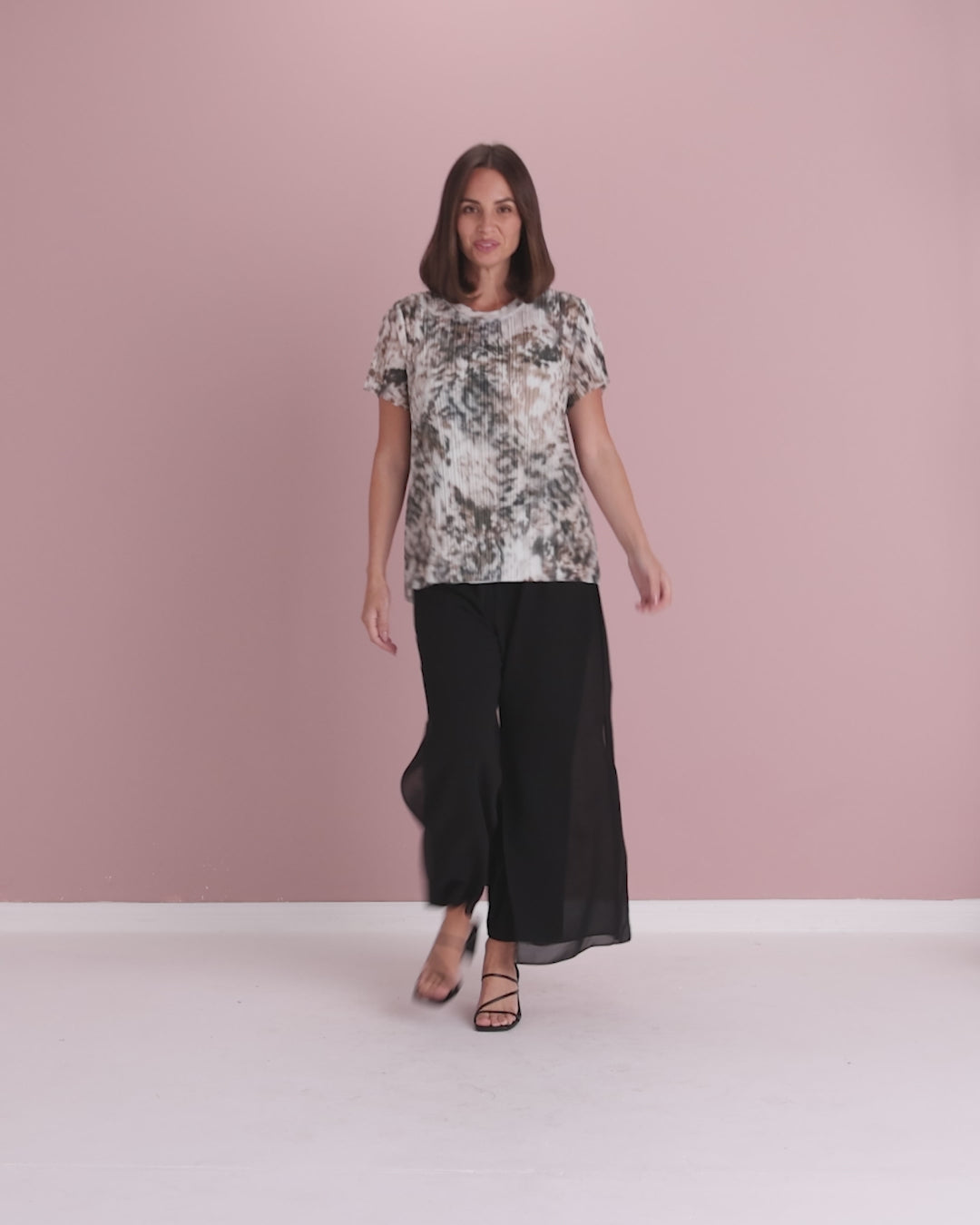The Gilliana Crop Chiffon Overlay Pants bring instant elegance to any outfit. The smooth pull-on waistband is wonderfully comfortable, while the wide leg shape skims over the figure without clinging. A sheer chiffon outer layer floats over an opaque inner pant, creating beautiful movement as you walk and just a hint of swish at the hem. Dress them up with a beaded top and heels for evenings, cruises and special events, or keep it simple with a soft tee for relaxed dinners. A fabulous go-to when you want dressy black pants that still feel relaxed.