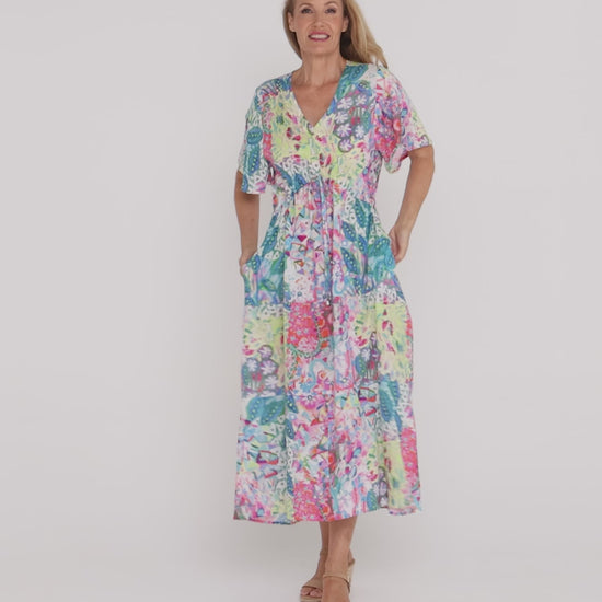 Joyful, airy and effortlessly flattering, the Glinda Cotton Maxi Dress in Pastel Kaleidoscope is designed for warm days when comfort and colour go hand in hand. This playful print blends soft pastels in pink, aqua, mint and sunshine tones, creating a lively yet wearable look that feels fresh and uplifting. Crafted from ultra lightweight pure cotton seersucker, the fabric has a softly crinkled texture that allows airflow and movement, making it ideal for hot weather and travel. The V neckline and flutter sleeves create a relaxed, feminine shape, while the adjustable drawstring waist allows you to define the fit to suit your body. Finished with in-seam pockets and a flowing maxi skirt, this is an easy throw-on dress for holidays, long lunches and everyday summer dressing.