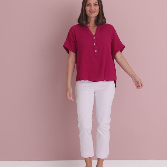 The Gracie Cotton Muslin Top in Raspberry adds a fresh pop of colour to your everyday essentials. Crafted from 100% cotton, it’s perfect for keeping cool in warm weather. Designed with an open grandad collar and a subtle V-neck, it includes button accents across the bust and extended short sleeves for a comfortable, relaxed fit. The breathable muslin fabric and gently curved hem provide lightness and ease, making it an excellent choice for sunny days.