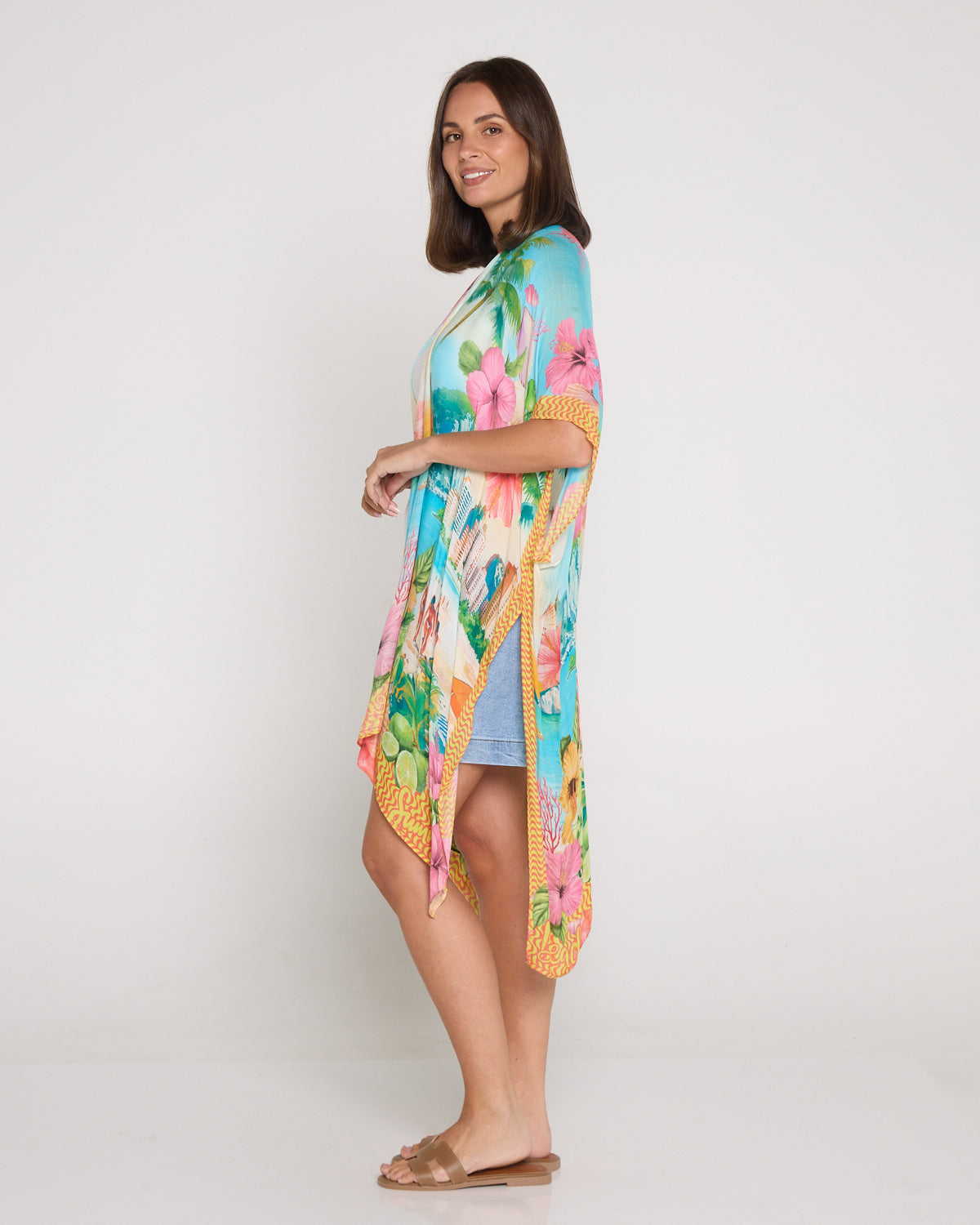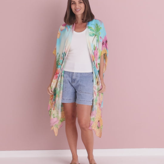 Turn heads with the Hibiscus Bay Wrap – your ultimate holiday-ready layer. Crafted from 100% viscose, this lightweight throw is soft, breathable, and effortlessly drapes over swimwear or casual outfits. With its vivid tropical print featuring palm trees, florals, and beach scenes, it’s made for sunny days and balmy nights. Whether you're lounging poolside or heading out for lunch, this wrap brings instant summer vibes to your look.