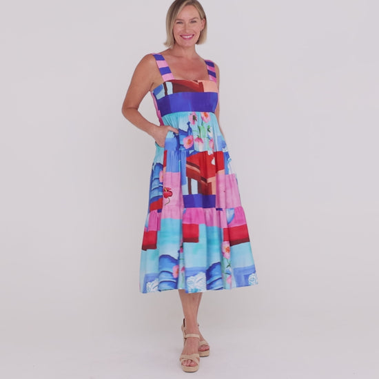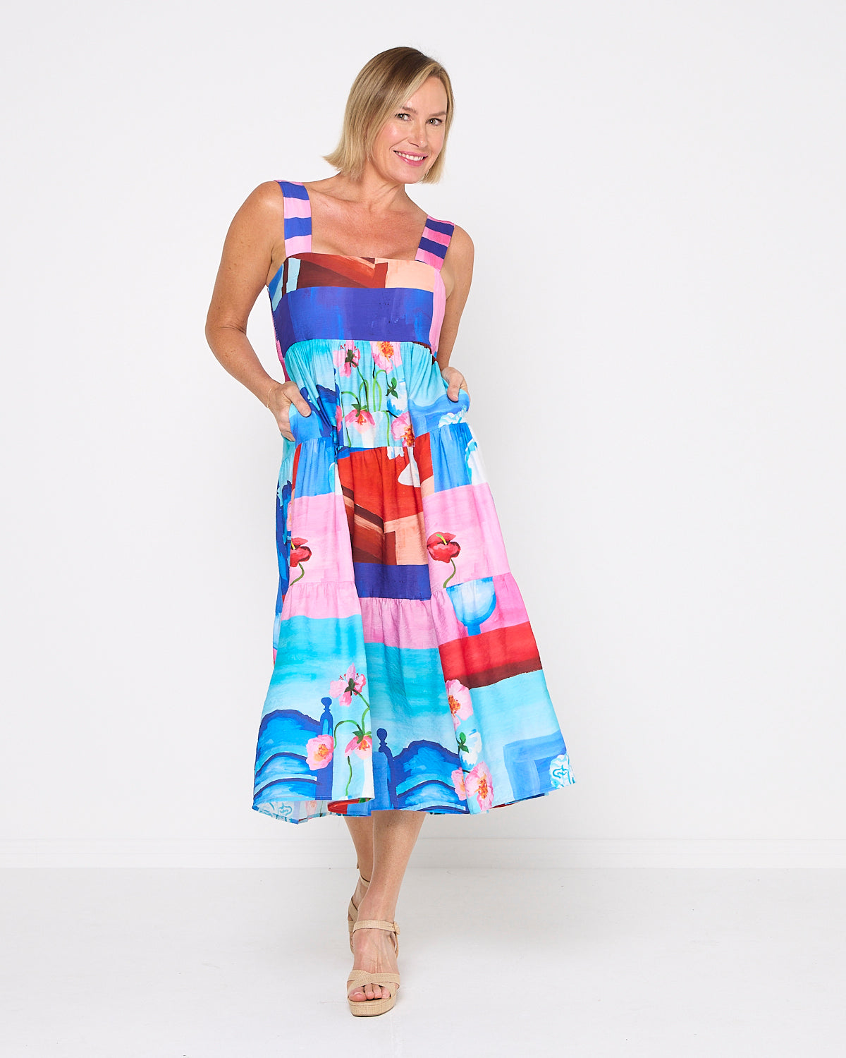 The Horizon Sleeveless Dress in the Summer Gallery print is a joyful, statement-making style designed for easy summer dressing. Featuring an art-inspired patchwork of painterly blues, pinks and warm accents, this dress feels vibrant without being overwhelming. The structured square neckline and wide straps create a flattering, balanced shape through the bodice, while the softly gathered waist flows into a tiered skirt for movement and ease. Practical side pockets add everyday functionality, and the woven rayon fabric holds its shape beautifully without clinging. Ideal for warm days, holidays or relaxed events, this is the kind of dress that does all the talking with minimal effort - just add sandals or wedges and go.