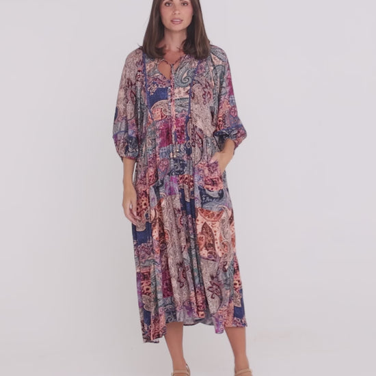 The India Dress in Dusk Paisley Patchwork is a relaxed, easy-wearing style designed for comfort and everyday versatility. Featuring a richly detailed patchwork of paisley motifs in layered dusk tones, this dress brings colour and interest without overwhelming the silhouette. Crafted from a bamboo-rayon woven fabric, it has a smooth, breathable feel and a fluid drape that sits softly on the body without being floaty. The relaxed shape allows for effortless movement, while the softly shaped neckline and gentle gathering through the skirt add subtle structure. Ideal for warm days, travel or casual outings, this is a dependable throw-on style with timeless appeal.