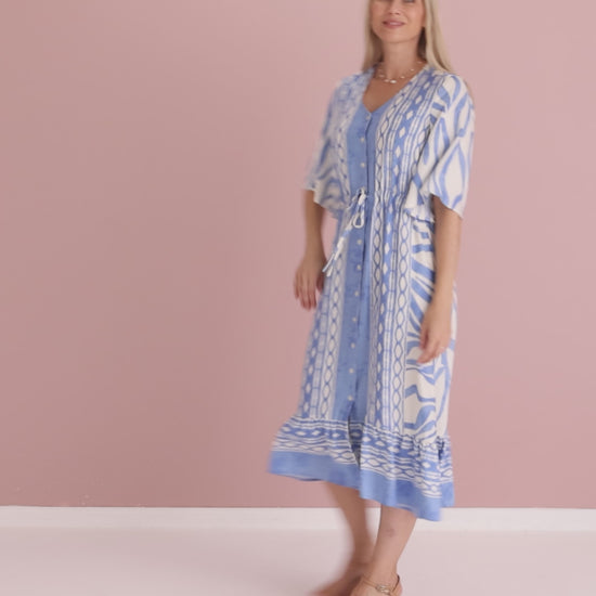 The Indigo Sands Dress brings effortless coastal charm to your everyday wardrobe. Crafted from a soft, lightweight rayon-nylon blend, it drapes beautifully while staying cool and breathable on warm days. The striking mix of geometric and animal-inspired stripes in soft indigo and ivory creates a unique statement, balanced by a relaxed silhouette that’s easy to wear. A subtle V-neckline, button front, drawstring waist and tiered hem offer shape without compromising comfort, making this a perfect throw-on dress for lunches, holidays or relaxed weekends.