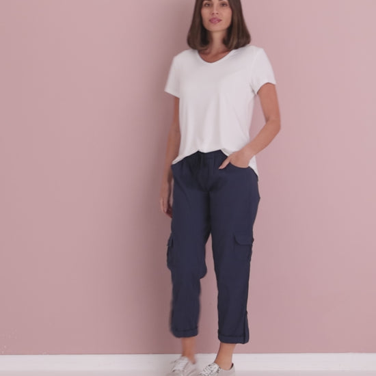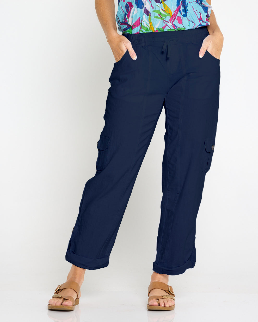 Effortlessly cool and endlessly versatile, the Issy Cargo Pants now arrive in a timeless navy – perfect for workdays, weekends, or travel. Crafted from a breathable linen blend with a touch of stretch, these relaxed tapered pants combine comfort with a utility-inspired edge. The elastic waistband with drawstring ensures a flexible fit, while the cargo pockets and roll-up tab hems deliver both function and flair. Whether styled full-length or cropped, they’re a staple you’ll reach for again and again.