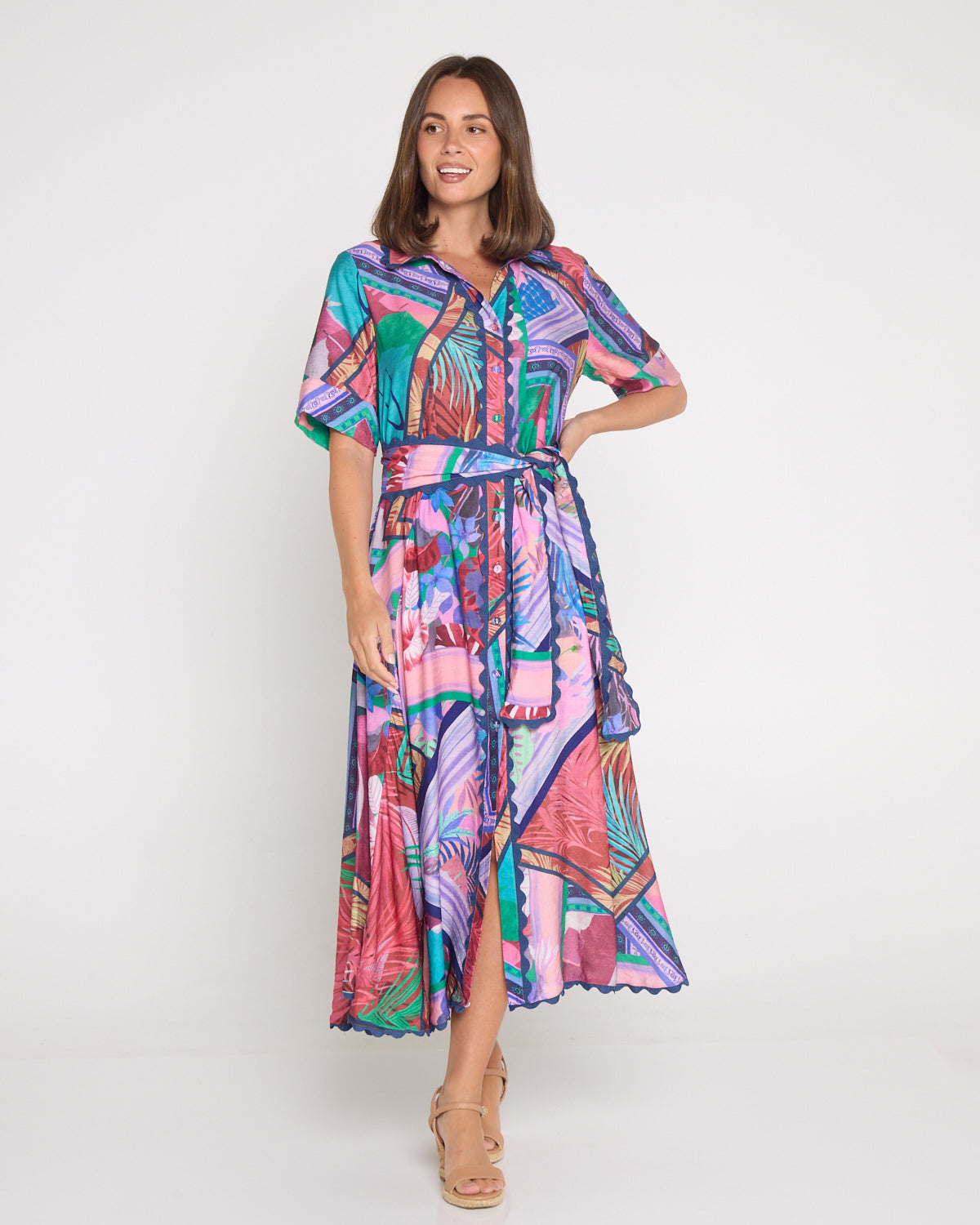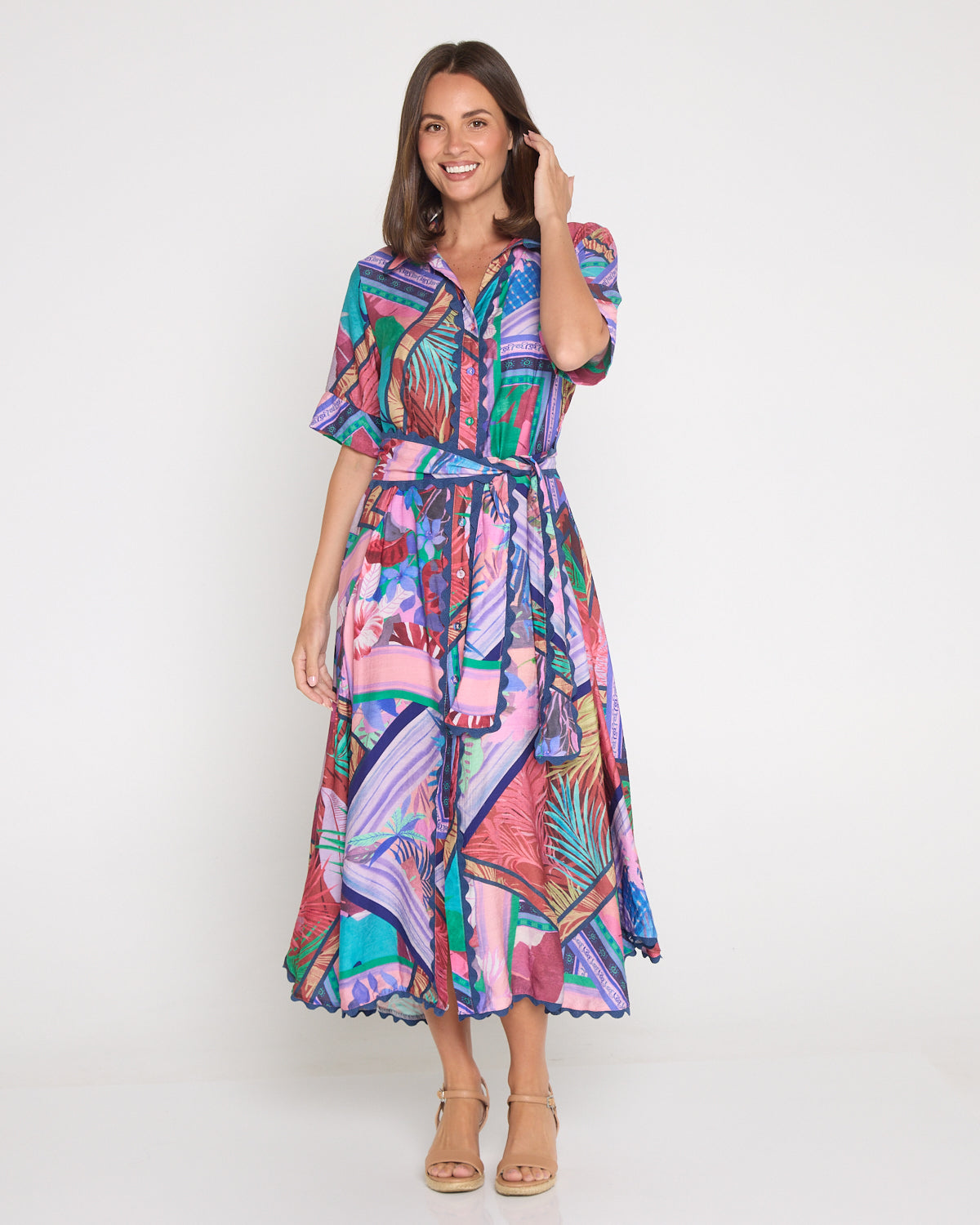 Colour-soaked and full of swish, the Jacinta brings resort polish to everyday wear. A collared V neckline and button front keep it refined, while the wide sash belt lets you define the waist or wear it loose for an easy A-line fall. The soft viscose-blend drapes beautifully and finishes with a scalloped ric rac edge that moves as you walk. Perfect with wedges for long lunches, garden parties or cruise nights—vibrant, flattering and effortless.