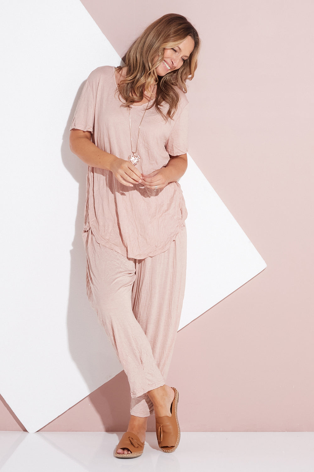A simple new style from Cotton Village, the Jackie Top is a lovely basic tee. With a v neck, short sleeves and curved hem, the design is easy fitting and comfortable. The stretch cotton jersey is soft and low maintenance, you'll enjoy having this piece on hand for easily styled outfits. The soft pink hue is so pretty and acts as a versatile neutral that is so easy to pair with so many colours.