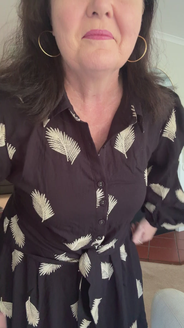 Bring a touch of effortless elegance to your wardrobe with the Jaycee Dress in black with gold embroidered leaves. Designed with timeless charm and modern comfort in mind, this shirt dress features a beautifully tiered silhouette, flattering waist tie, and floaty skirt that moves gracefully with you. The lightweight woven fabric drapes beautifully, while the gold leaf embroidery adds a luxe finish perfect for day-to-night wear.