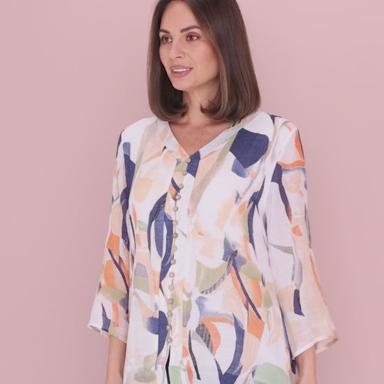 Look at this absolutely divine blouse is shades of peach, sage and navy on a crisp, white backdrop.