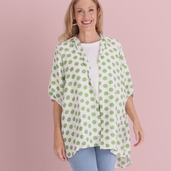 A long-time favourite from Cotton Village, the Kara Comfort Shirt returns in a fresh Green Spot print that feels playful yet easy to wear. Featuring soft sage green spots against a light base, this colourway adds interest without overpowering your outfit. Designed with a relaxed, oversized silhouette, it offers effortless comfort while still looking polished. Wear it buttoned as a tunic-style shirt or open over a tank as a lightweight layering piece for warmer days. Crafted from a smooth woven fabric with a soft, fluid drape, this is one of those versatile styles you’ll reach for again and again for everyday wear, travel and relaxed weekends.