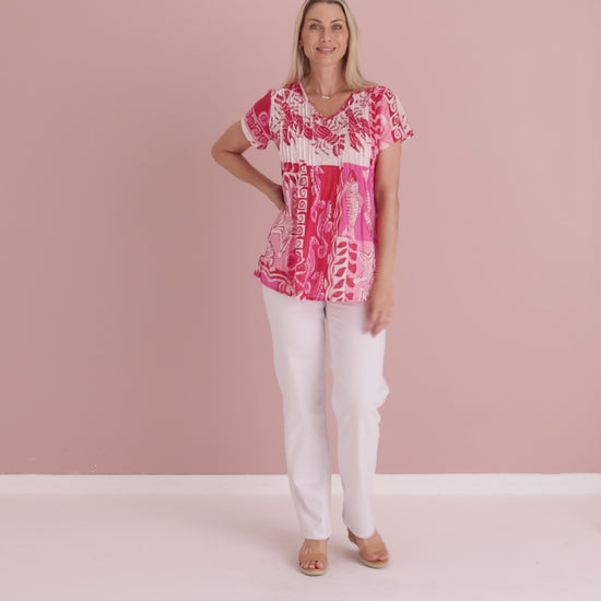 The Kayla Cotton Top in Mono Sea Red brings a lively coastal twist to your summer wardrobe. Crafted from pure cotton, it feels naturally cool and breathable, perfect for warm days and relaxed outings. The vibrant mosaic-style print features shells, seahorses, florals and waves in a joyful mix of reds, pinks and soft blush tones. Gentle pleating at the bodice adds flattering shape without clinging, while the relaxed silhouette and soft short sleeves make it beautifully easy to wear. Pair it with white pants for a crisp, fresh look, or slip it on with denim for effortless everyday style. Ideal for holidays, lunches, markets and weekend adventures.
