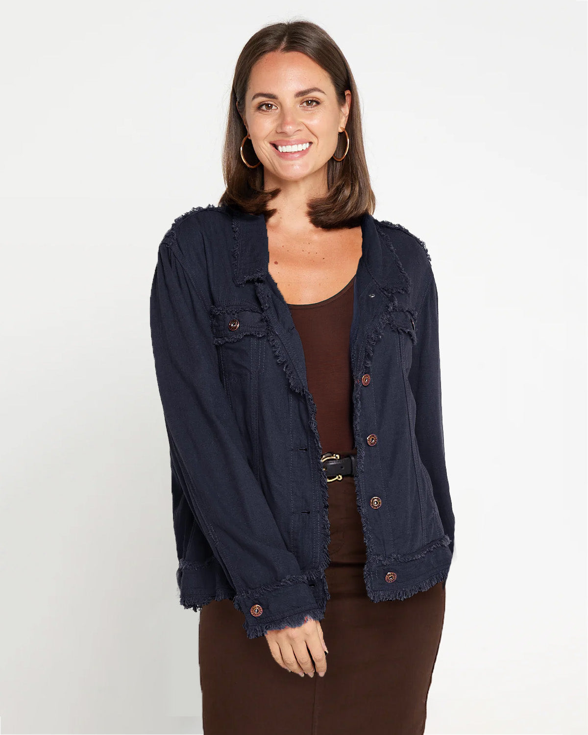 The Kendall Linen Fringe Jacket in Navy reimagines the traditional utility jacket with a contemporary edge. Made from breathable, lightweight linen, it features brass-tone buttons, flap pockets, and raw-edge detailing that enhance its texture and appeal. Designed for versatility, it can be worn open for a casual layered look or buttoned up to create a polished silhouette, making it an ideal choice to refine your everyday wardrobe.