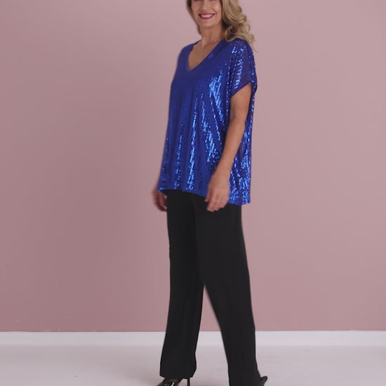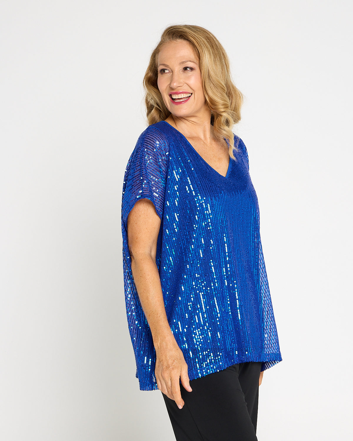 Turn every outing into an occasion with this dazzling sequin top. In a vivid electric blue, the Sparkle Tonight glimmers beautifully under evening lights while the relaxed drape keeps things comfortable and flattering. A soft stretch jersey lining smooths the silhouette and prevents scratchiness, so you can dance, dine and celebrate with ease. Style it with black pants and heels for parties and special dinners, or dress it down with dark denim and a blazer for instant after-five polish.