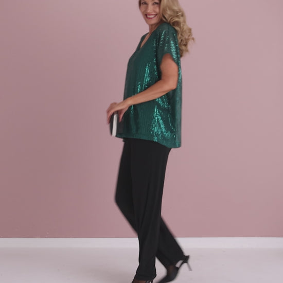 Turn every outing into an occasion with this dazzling sequin top. In a stunning Jade Green, the Sparkle Tonight glimmers beautifully under evening lights while the relaxed drape keeps things comfortable and flattering. A soft stretch jersey lining smooths the silhouette and prevents scratchiness, so you can dance, dine and celebrate with ease. Style it with black pants and heels for parties and special dinners, or dress it down with dark denim and a blazer for instant after-five polish.
