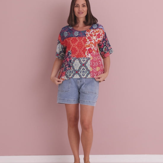 A cheerful patchwork of sunset tones—coral, navy, teal and saffron—makes the Laina an instant mood-booster. Cut from breathable pure cotton, it drapes lightly with a relaxed, boxy silhouette that skims the body without clinging. The scoop neckline flatters the décolletage while easy short sleeves offer airy coverage. Team with denim shorts on hot days, white capris for lunch dates or a flowing skirt for weekends away. A simple, throw-on style that brings colour and comfort to everyday dressing across the Australian summer.