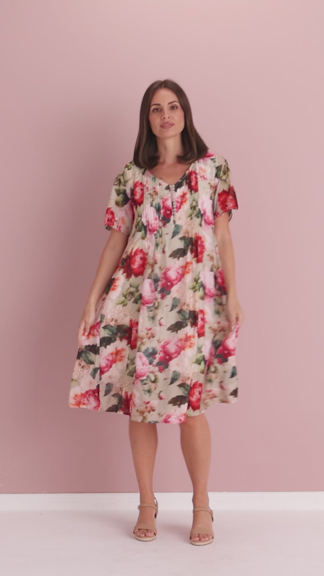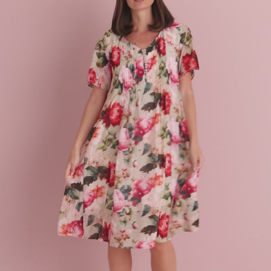 Bright, feminine and effortlessly wearable, the Lamia Dress – Romantic Garden is designed to bring colour and ease to warm-weather dressing. The softly draped woven fabric skims the body rather than clinging, creating a flattering silhouette that feels light and comfortable all day. A soft V neckline with a delicate buttoned half placket and pintuck detailing draws the eye downward, subtly elongating the torso. Short sleeves and a gently flared A-line skirt add movement, while the lined body provides confident coverage without compromising the floaty feel. Perfect for garden parties, weekend lunches and summer celebrations, this is a dress you’ll reach for again and again. Style with espadrilles for brunch, slides on holiday, or layer with a denim jacket for cooler evenings.