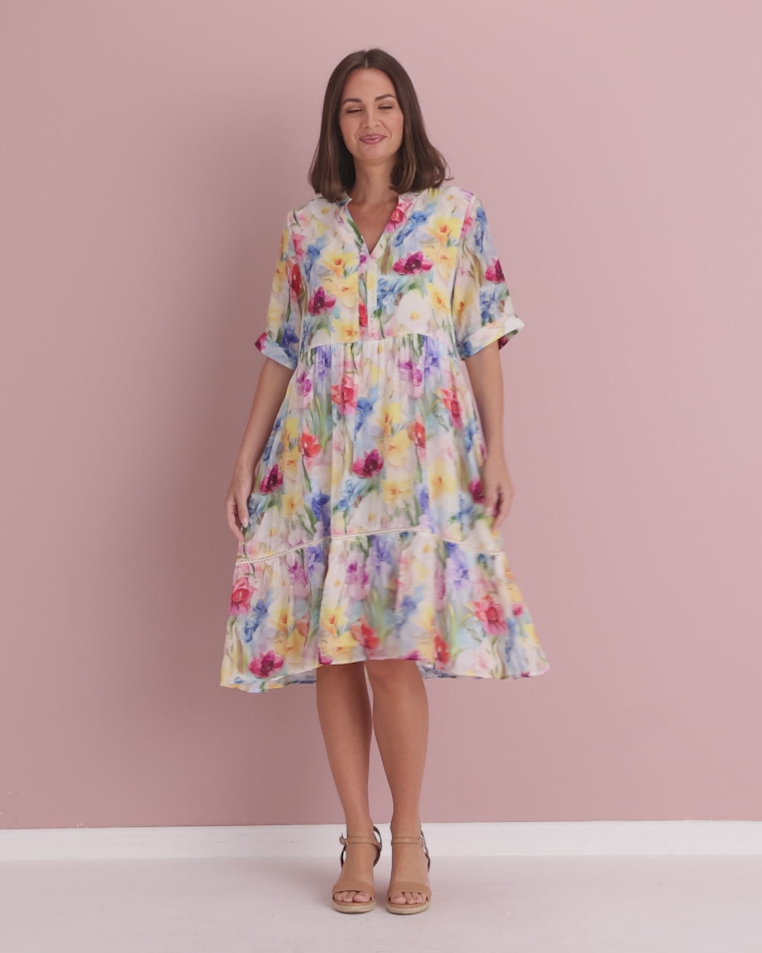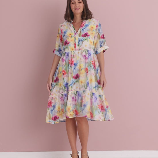 Sunlit florals and an easy, floaty silhouette make the Lillian Dress a joy to wear. Cut from lightweight faux silk chiffon (viscose/poly), it has that soft, airy drape with a gentle sheen that elevates everyday dressing. The split V neckline opens the face, while the softly defined empire waist and tiered skirt create a flattering line that skims rather than clings. Crochet-look trim adds a pretty touch, and side pockets keep it practical. Style with wedges and a straw bag for brunch, then switch to metallic sandals for evening. Cool, colourful and perfect for warm Aussie days.