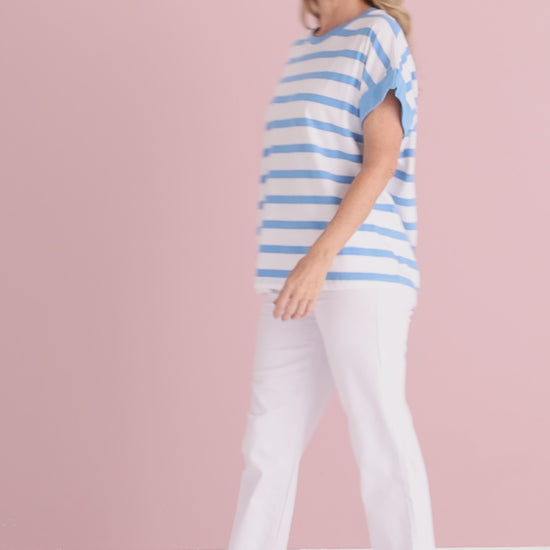 An effortless everyday staple, the Maddison Tee in Azure White Stripe by Elm brings fresh coastal energy to your casual wardrobe. Crafted from pure cotton, this tee feels soft, breathable and comfortable against the skin – ideal for warm Australian days. The classic stripe design in crisp white and vibrant azure blue is lifted with thoughtful details, including rolled cuff sleeves and a button-through placket down the back for a subtle point of difference. Cut in an easy, relaxed shape with a gently curved hem, it skims the body without clinging and offers flattering coverage front and back. Style it with white jeans, denim shorts or relaxed joggers for an easy, polished off-duty look.