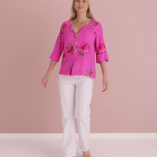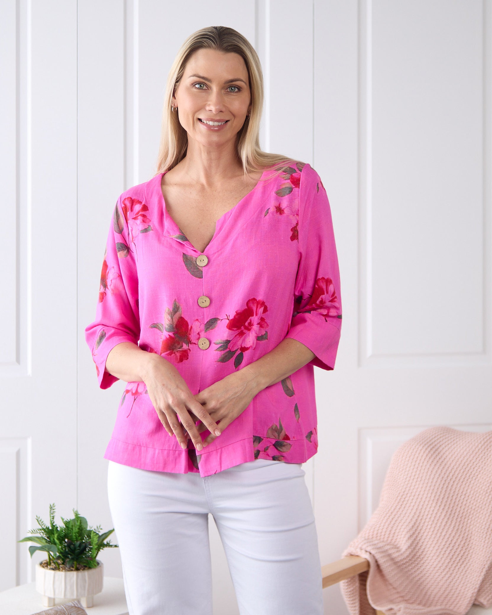 The Mahri Linen Top is back in a gorgeous new fuchsia and floral print. Loved for its breathable fabric and relaxed yet polished shape, this top is an everyday essential with personality. The soft linen blend feels cool against the skin, while the flattering notched neckline and decorative wooden buttons add a handcrafted charm. Style it with jeans for a casual weekend look or dress it up with linen pants for lunch with friends.
