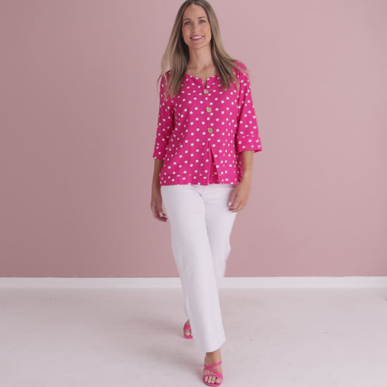 The Mahri Linen Top now arrives in a cheerful hot pink spot, perfect for brightening your everyday outfits. Cut from a breathable linen–cotton blend, it feels cool and comfortable while still holding a lovely shape. The notched neckline and 3/4 sleeves give coverage without bulk, while the feature buttons and front pleat add gentle structure and movement. Dress it down with white jeans and sandals for weekend errands, or style with linen pants and statement earrings for lunch with friends or summer get-togethers.