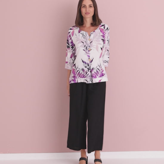 The Mahri Linen Top is back in a gorgeous new white and purple botanical print. Loved for its breathable fabric and relaxed yet polished shape, this top is an everyday essential with personality. The soft linen blend feels cool against the skin, while the flattering notched neckline and decorative wooden buttons add a handcrafted charm. Style it with jeans for a casual weekend look or dress it up with linen pants for lunch with friends.