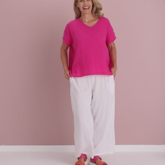 Meet your new summer staple. The Maldives Cotton Muslin Top in Hot Pink brings that instant mood-boosting pop of colour while keeping you cool and comfortable. Cut in our easy, slightly less-oversized shape this season, it skims the body without clinging and falls gracefully with longer sides for a flattering drape. The airy cotton muslin feels soft and breathable on warm days, while the V neckline and relaxed kimono-style sleeves add effortless polish. Pair with white pants for brunch, linen shorts for holidays, or layer over swimmers on coastal getaways.