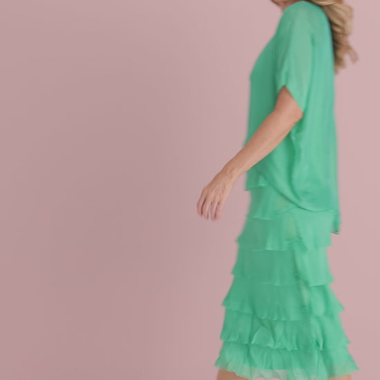 The Margo Silk Dress has been exceptionally popular, and it has just come back in a stunning jewel tone green for a classic lookTaking inspiration from the flapper dresses of the 1920s, this stunning silk blend dress features a ruffle layered skirt with raw edges for a natural fringed effect. Combined with the silky overlay and soft, supple jersey underlay, this is a dress that truly looks and feels luxurious.