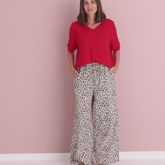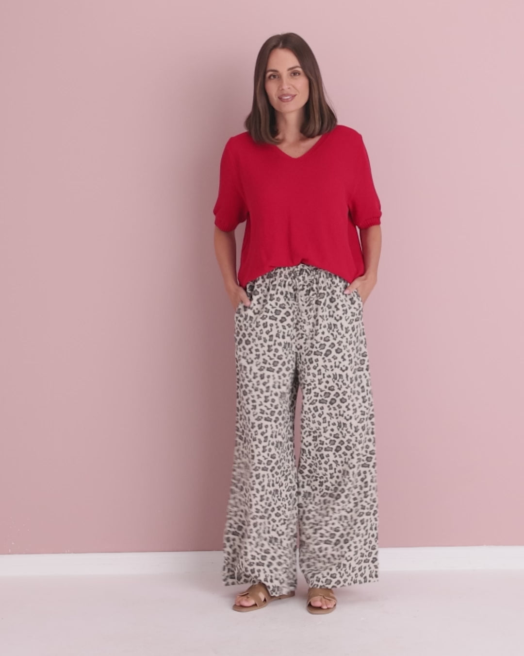 Bring effortless drama to warm-weather outfits with the Marinda Pants. The soft beige base is scattered with an easy neutral leopard, while a subtle side stripe adds a sporty edge. Cut in a relaxed wide leg, they skim and flow without clinging—perfect with a simple tee and slides for weekends, or a black cami and wedges for dinner. The comfy pull-on waistband with drawstring adjusts to you, and the breathable linen blend keeps things cool on hot Aussie days.