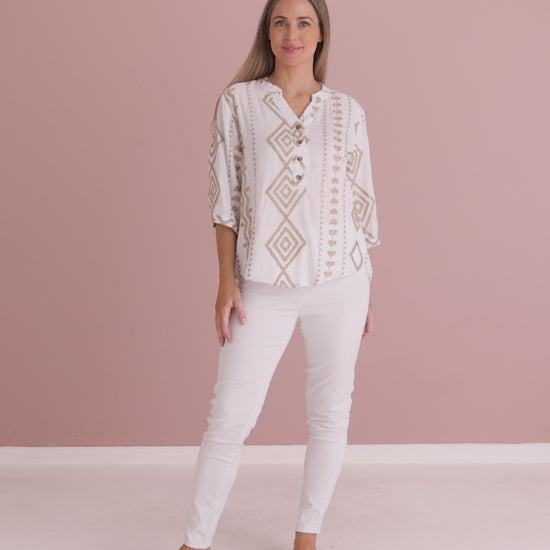 The Marli Top in White/Gold Embroidery is fresh, light and effortlessly polished. A refined band collar with a V-cut neckline frames the face, while the soft woven fabric drapes beautifully for a relaxed, flattering fit. The soft white base is embroidered with metallic gold patterns—easy to pair with denim, linen or tailored pants for a casual glamour.