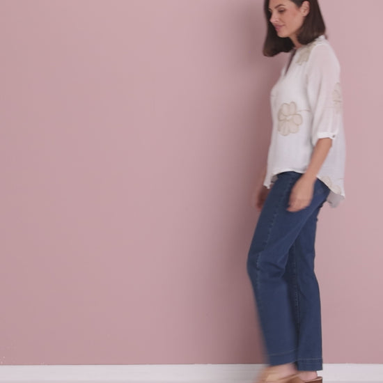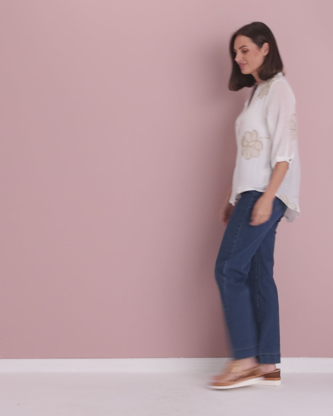 The Marli Top in White Petal is fresh, light and effortlessly polished. A refined band collar with a V-cut neckline frames the face, while the soft woven fabric drapes beautifully for a relaxed, flattering fit. The white base is scattered with delicate beige petal motifs—easy to pair with denim, linen or tailored pants. Thoughtfully double lined through the front for extra coverage, it’s a breezy choice for warm days and a versatile layer under blazers or cardis.