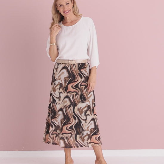 The Mavi Mesh Skirt in Latte Swirl is a beautiful blend of movement, comfort and understated drama. Featuring a softly patterned mesh overlay with fine micro pleats, this skirt creates elegant vertical lines that flatter the body without clinging. The tonal latte, caramel and black swirl print feels modern yet timeless, making it easy to dress up or down. A stretch jersey underlay provides comfortable coverage, while the longer mesh overlay adds depth and fluidity as you move. Style it with a simple knit or tee for daytime polish, or elevate it with a blouse and boots for effortless evening wear. A versatile piece that works across seasons and occasions.