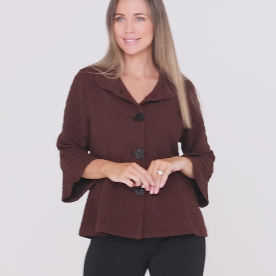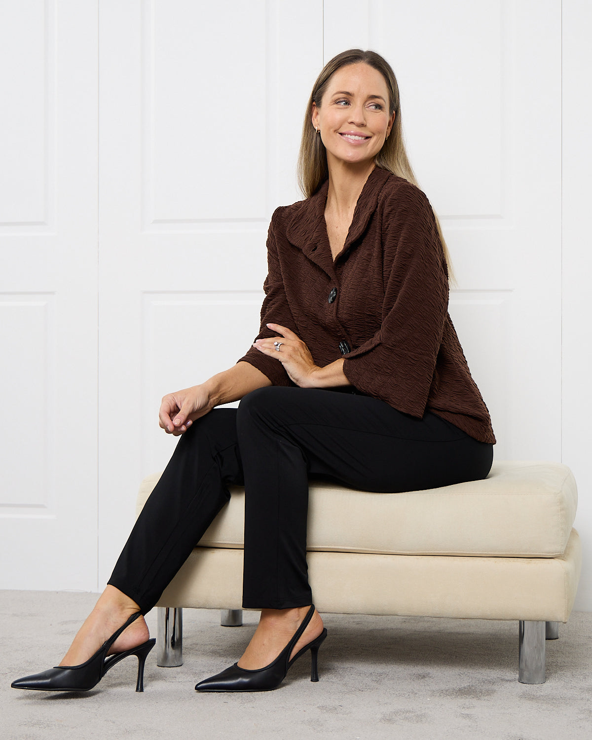 The Milan Jacket is a beautiful layering piece that feels just as good as it looks. The rich chocolate tone paired with the softly textured fabric makes it an easy choice for everyday wear, whether you're heading out for lunch or dressing up a simple outfit.