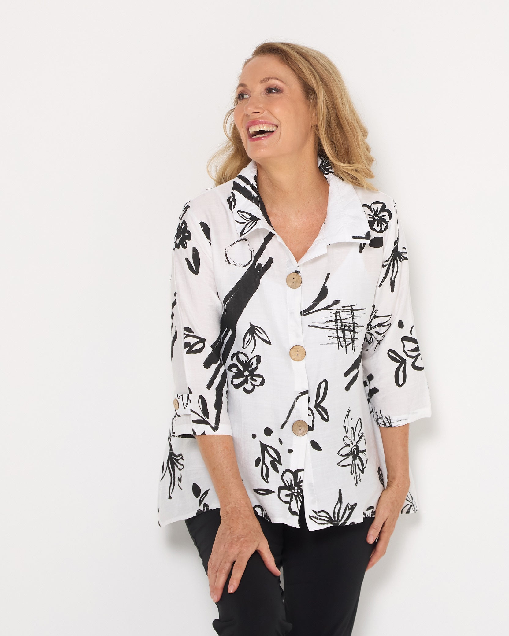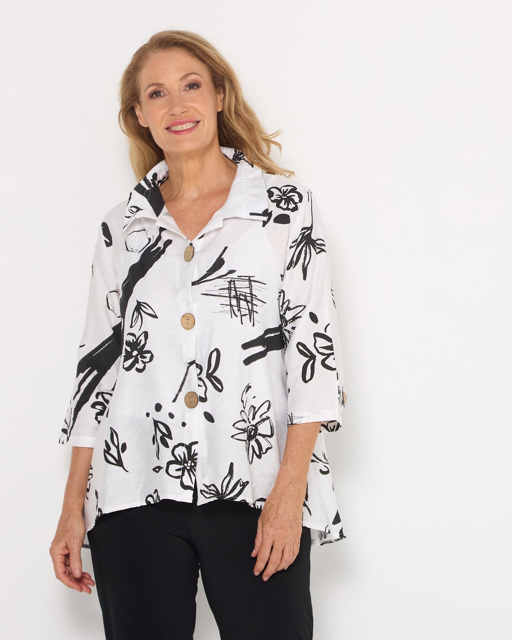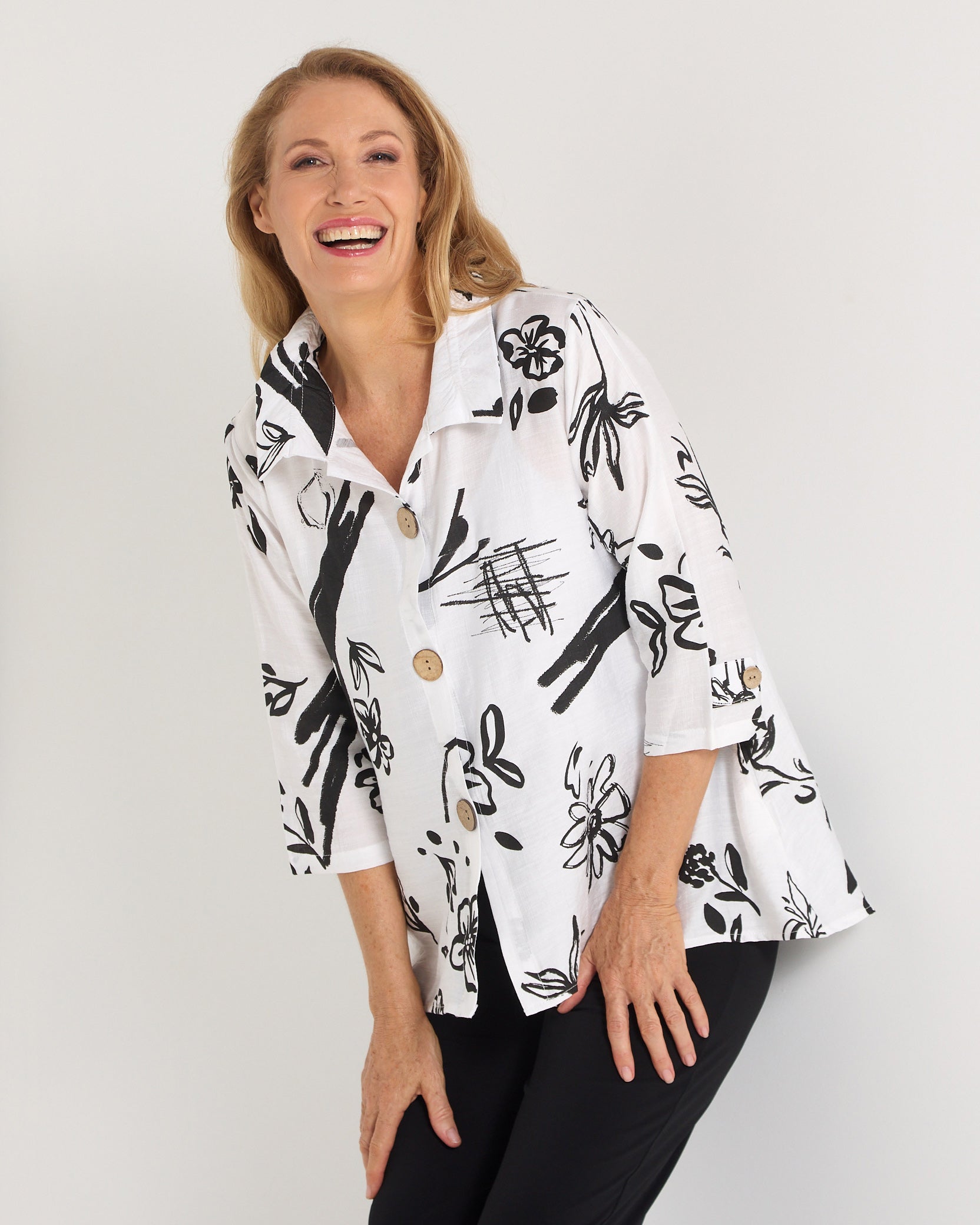 Modern, artistic and effortlessly flattering, the Monaco Sketch Shirt brings a bold monochrome statement to your everyday wardrobe. The crisp white base is layered with expressive black brushstroke florals and abstract linework, creating a striking yet versatile print that pairs beautifully with classic black pants or denim.