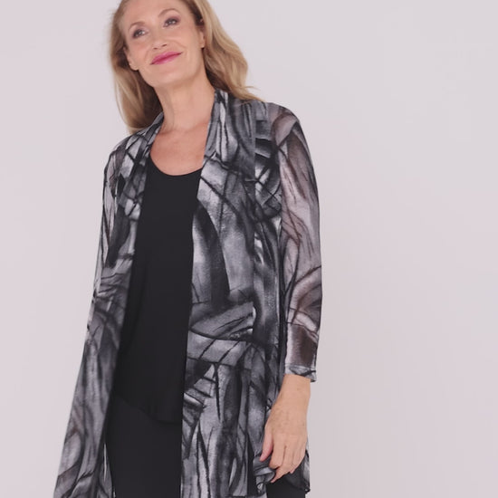 A modern monochrome layer that instantly refines any outfit. The Naomi Mesh Jacket in Silver Shadow features a striking abstract print in shades of silver, charcoal and black for a look that feels both contemporary and timeless.