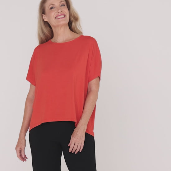 If your wardrobe needs a lift of colour, the Olivia Bamboo Top in Tangerine is the perfect place to start. This vibrant, easy-to-wear style brings warmth and energy while keeping the silhouette relaxed and effortless. Designed in a flattering tee shape with extended short sleeves and a longer back hem, it offers coverage without feeling heavy.