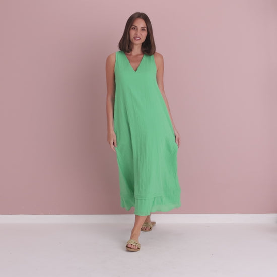 Breezy, elegant and wonderfully wearable, the Orsula Tank Maxi is made for warm Australian days. The sleeveless, V-neck bodice skims the shoulders and falls to a soft A-line silhouette that floats as you move, with functional side pockets for everyday ease. A pleated hem adds gentle swish and polish, while the breathable cotton-blend feels light on the skin. Fully lined to prevent sheerness, this easy-care style pairs beautifully with slides by day or gold accents after dark.