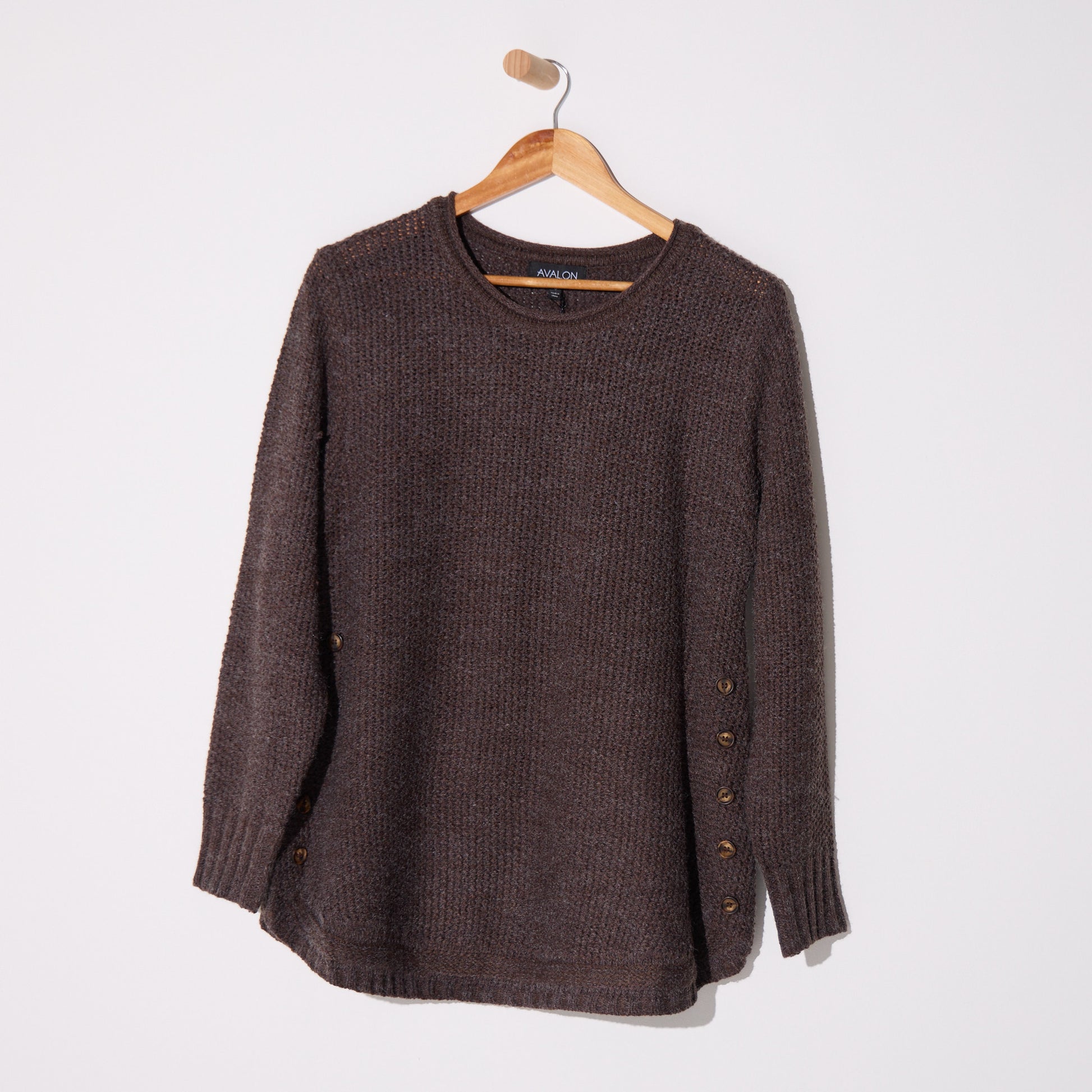 Crafted in a heavier weight knit, it provides comfortable warmth without stiffness. The rolled-edge neckline keeps it relaxed, while the wide rib accents at the cuffs and hem add shape and structure. Decorative side buttons give it that little extra detail that makes everyday dressing feel considered.