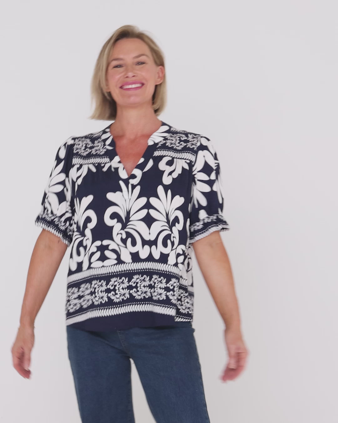 The Paulette Top in Navy is one of those easy, confidence-boosting pieces you’ll reach for again and again. Featuring a crisp white ornamental print against a deep navy base, this style feels timeless with a relaxed, modern edge. The woven fabric drapes gently through the body, offering a flattering shape without clinging, while the V neckline creates a clean, elongating line through the front. Short sleeves with subtle gathering provide comfortable coverage and a soft finish at the arm. Easy to dress up or down, this versatile women’s top works beautifully with denim, white pants or relaxed tailoring, making it ideal for everyday wear, casual workdays or weekend outings.