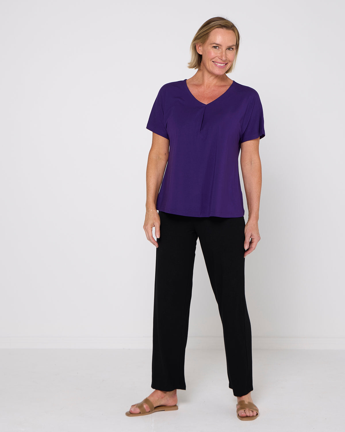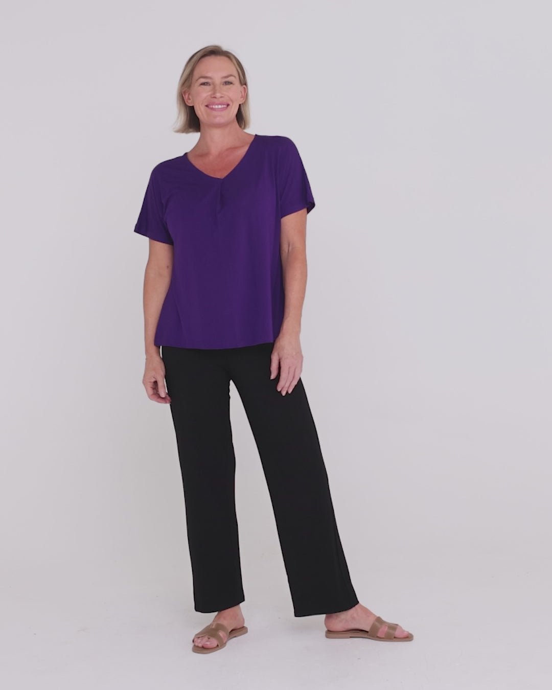 Refined yet effortless, the Pleat Neck Bamboo Tee by Whispers brings a polished touch to everyday dressing. Crafted from beautifully soft stretch bamboo jersey, it drapes smoothly over the body while offering natural movement and comfort. The subtle pleat detail at the neckline adds gentle shaping and interest without fuss, elevating this beyond a basic tee. With its relaxed silhouette and easy short sleeves, it pairs perfectly with tailored pants, travel pieces or your favourite casual staples.