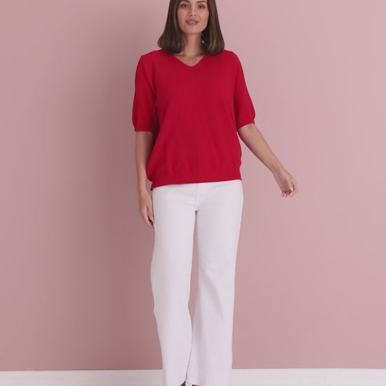 The Rachel Cotton Knit Top is a versatile piece featuring a V-neckline and drop shoulders for a relaxed fit. Now available in a rich red, it will be perfect for the Christmas season. The half-length sleeves with ribbed fitted cuffs add a touch of structure, while the ribbed hem ensures a flattering silhouette. Crafted from pure cotton, this lightweight knit has a fine waffle-like texture, making it perfect for layering or wearing on its own during warmer weather. Ideal for casual days or dressing up with accessories.